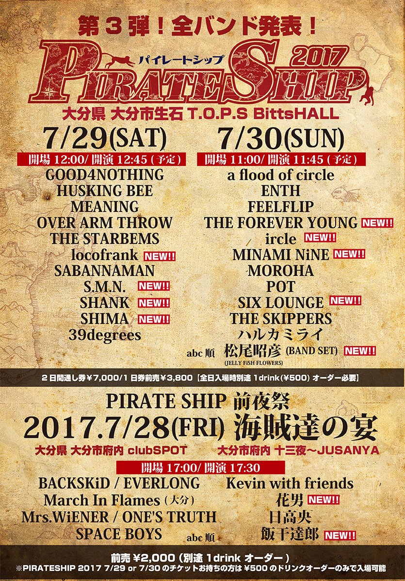 「PIRATE SHIP 2017」■出演/a flood of circle・ENTH・FEELFLIP・THE FOREVER YOUNG・ircle・MINAMI NiNE・MOROHA・POT・SIX LOUNGE・THE SKIPPERS・ハルカミライ・松尾昭彦(BAND SET)