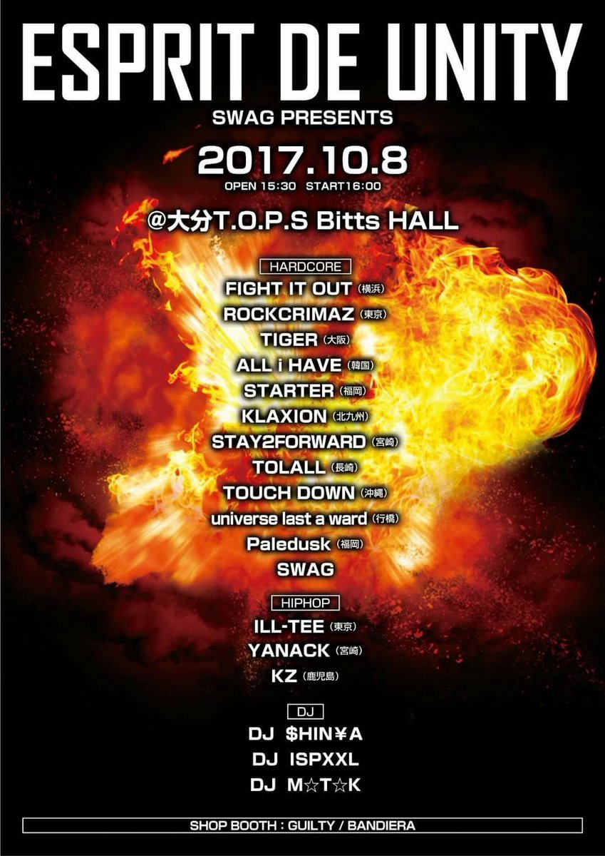 SWAG presents「ESPRIT DE UNITY」■出演/FIGHT IT OUT(横浜)・ROCKCRIMAZ(東京)・TIGER(大阪)・ALL i HAVE(韓国)・STARTER(福岡)・KLAXION(北九州)・STAY2FORWARD(宮崎)・TOLALL(長崎)・TOUCH DOWN(沖縄)・universe last a ward(行橋)・Paledusk(福岡)・SWAG
