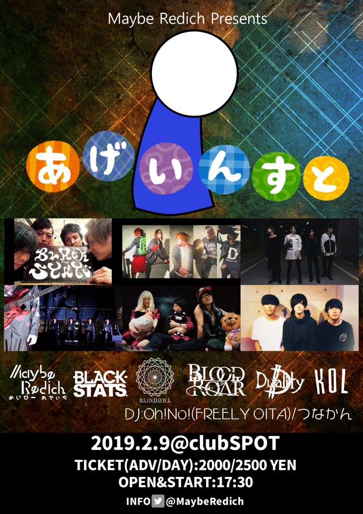 MaybeRedich presents"あげいんすと"■出演 [BAND] MaybeRedich・BLOOD ROAR(東京)・BLACK-STATS.・BLiND OWL・Duality・KOL [DJ] Oh!No!(FREELY OITA)・ つなかん・きーふぁー(FREELY OITA)・yukkey(FREELY OITA)