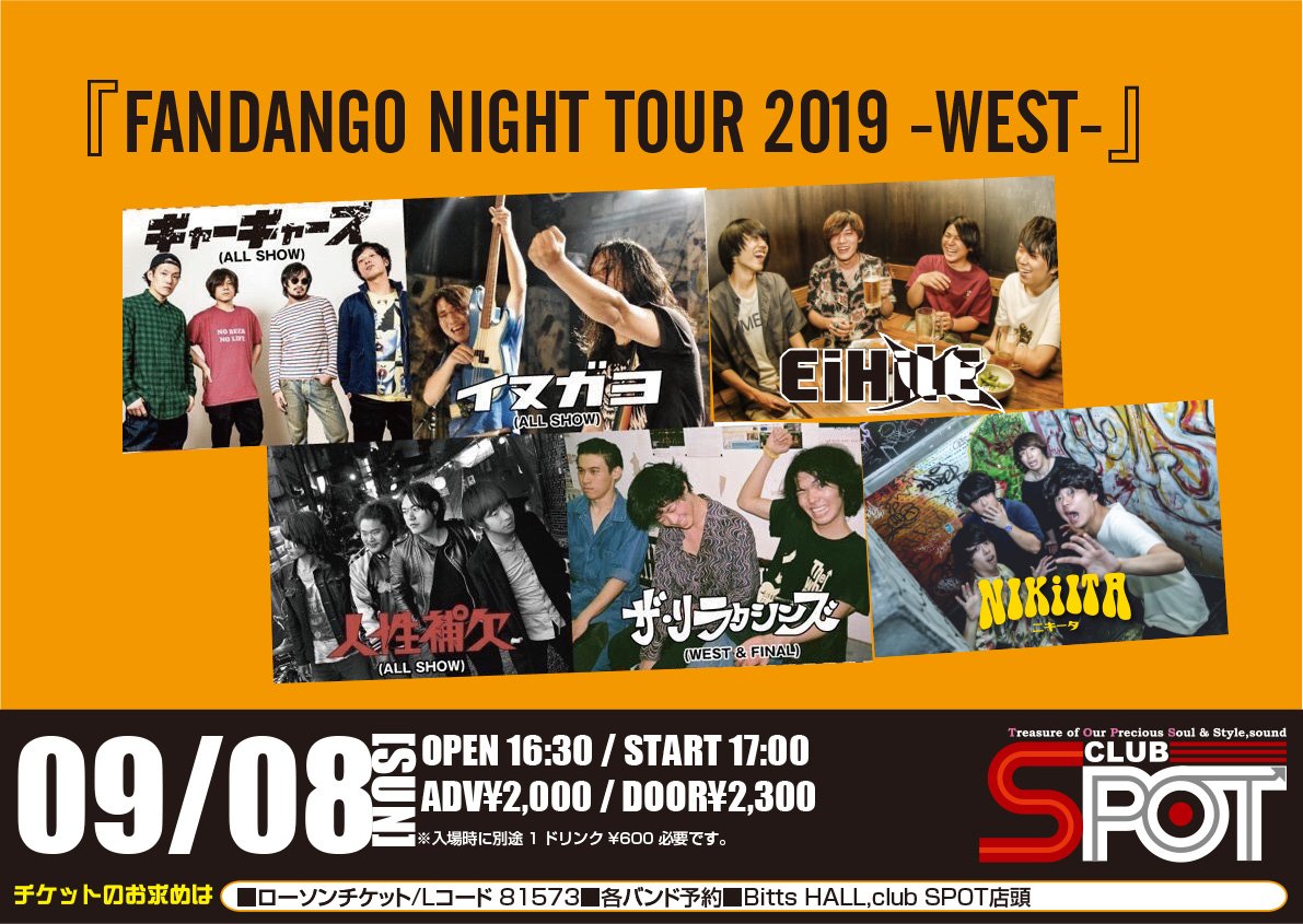 『FANDANGO NIGHT TOUR 2019 -WEST-』■出演 ギャーギャーズ /イヌガヨ /人性補欠 /ザ・リラクシンズ/EiHilE/NIKiITA